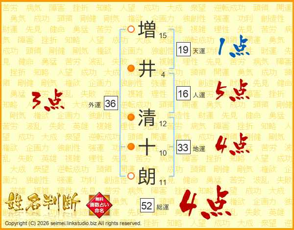 増(15画)井(4画) 清(12画)十(10画)朗(11画)