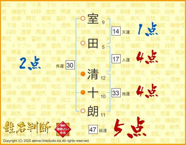 生活面を象徴する運勢です。外部から受ける影響力を表し、結婚運、家庭運や職場、環境への順応性を表します。総運から人運を引いた画数。姓や名が1文字の場合を除く。