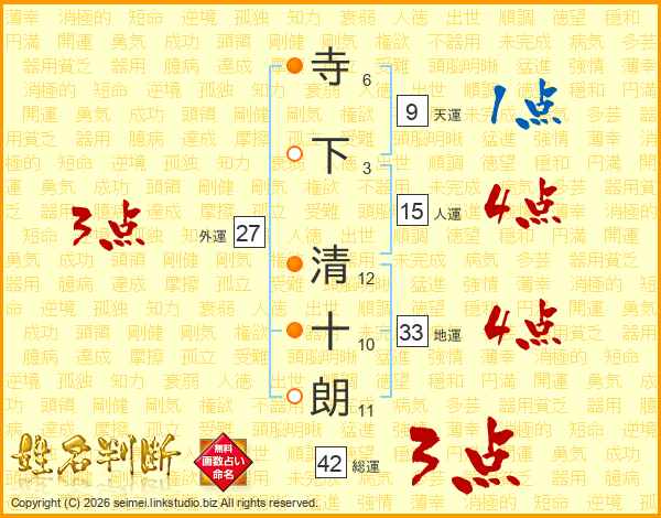 寺(6画)下(3画) 清(12画)十(10画)朗(11画)