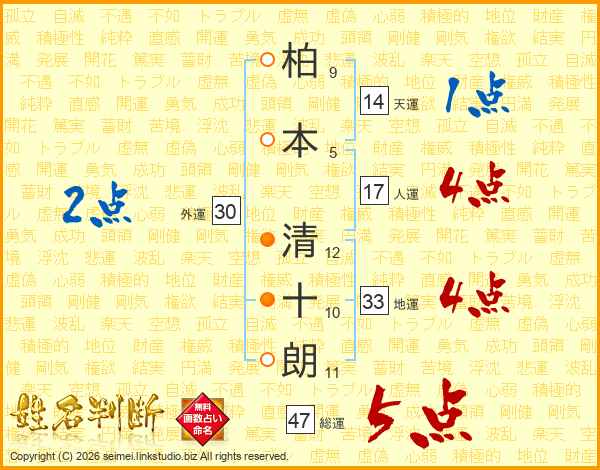 柏(9画)本(5画) 清(12画)十(10画)朗(11画)