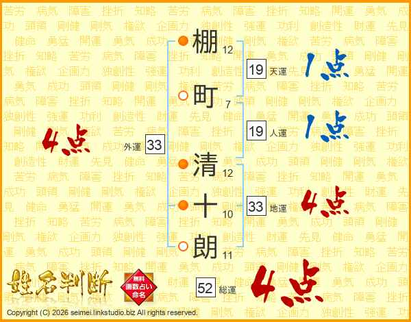 棚(12画)町(7画) 清(12画)十(10画)朗(11画)