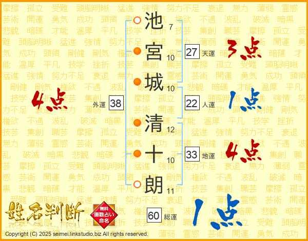 池(7画)宮(10画)城(10画) 清(12画)十(10画)朗(11画)