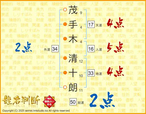 茂(9画)手(4画)木(4画) 清(12画)十(10画)朗(11画)