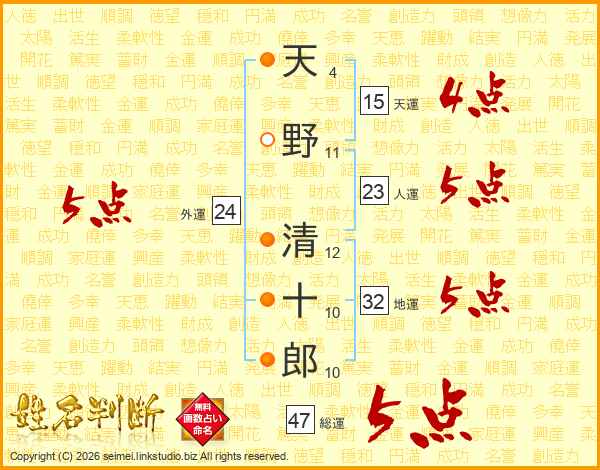 天(4画)野(11画) 清(12画)十(10画)郎(10画)