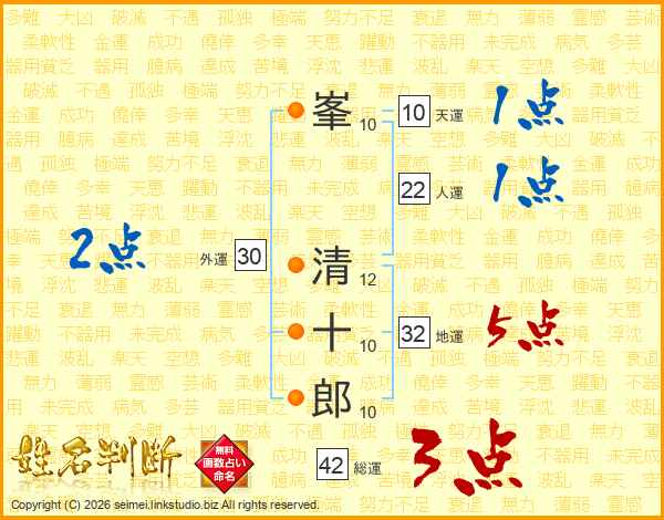 生活面を象徴する運勢です。外部から受ける影響力を表し、結婚運、家庭運や職場、環境への順応性を表します。総運から人運を引いた画数。姓や名が1文字の場合を除く。