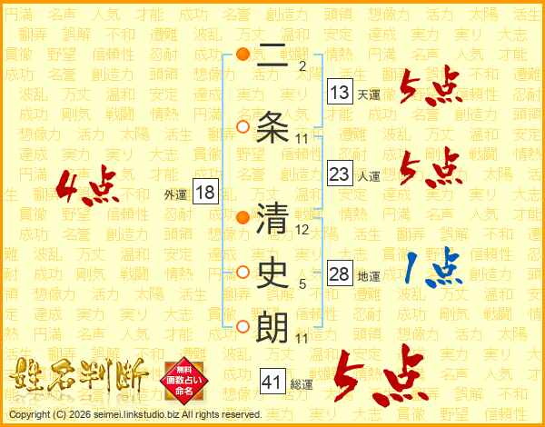 あなたの人生を表す1番重要な運勢です。生涯を通じて影響する総合運となり、主に50歳以降の晩年期に影響を及ぼします。苗字と名前の合計画数。