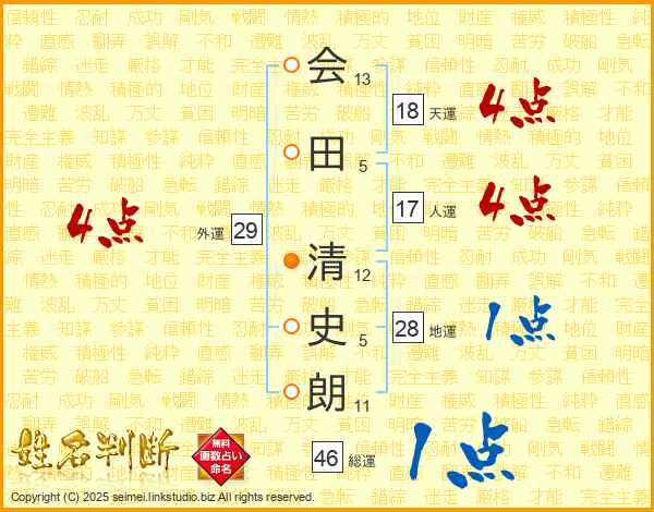 会(13画)田(5画) 清(12画)史(5画)朗(11画)