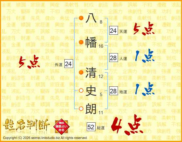 八幡清史朗さんの総運は52画の4点!
