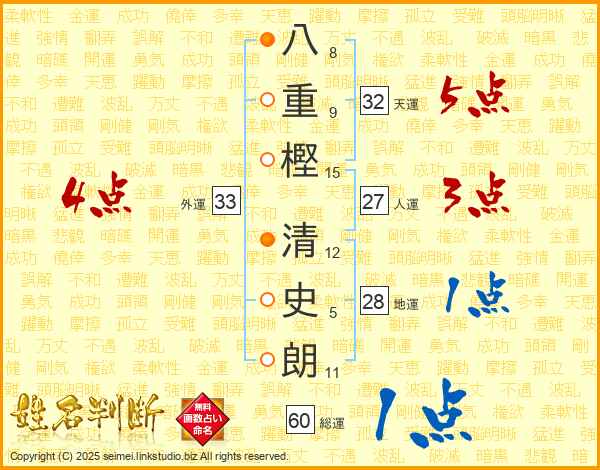 八(8画)重(9画)樫(15画) 清(12画)史(5画)朗(11画)