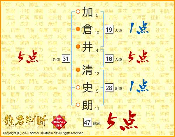 加(5画)倉(10画)井(4画) 清(12画)史(5画)朗(11画)