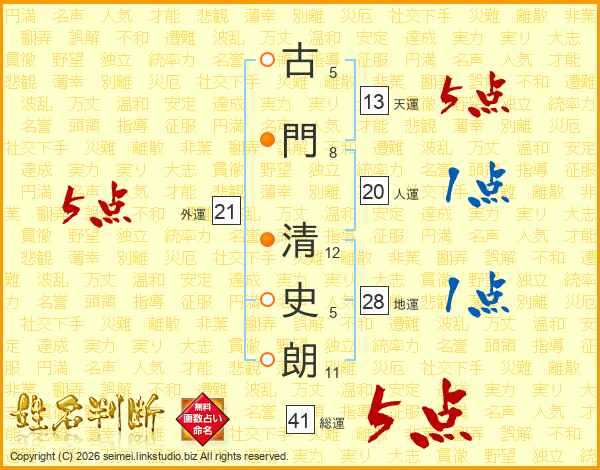 古門清史朗さんの総運は41画の5点!
