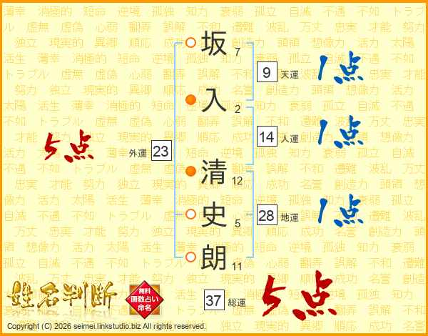 坂(7画)入(2画) 清(12画)史(5画)朗(11画)