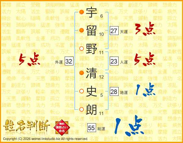 宇留野清史朗さんの外運は32画の5点!