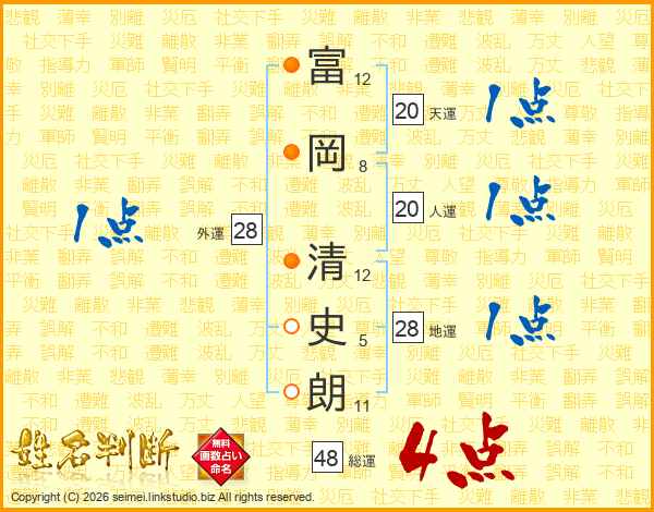 富(12画)岡(8画) 清(12画)史(5画)朗(11画)