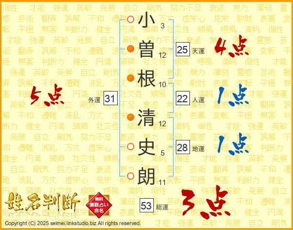 小(3画)曽(12画)根(10画) 清(12画)史(5画)朗(11画)