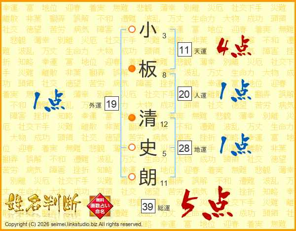 小板清史朗さんの総運は39画の5点!