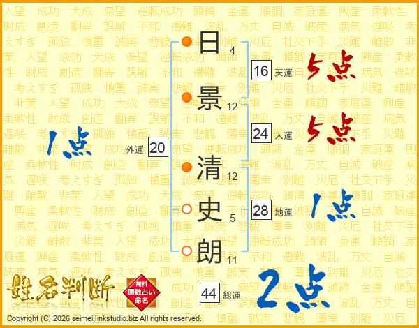 日(4画)景(12画) 清(12画)史(5画)朗(11画)