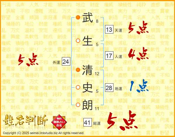 武(8画)生(5画) 清(12画)史(5画)朗(11画)