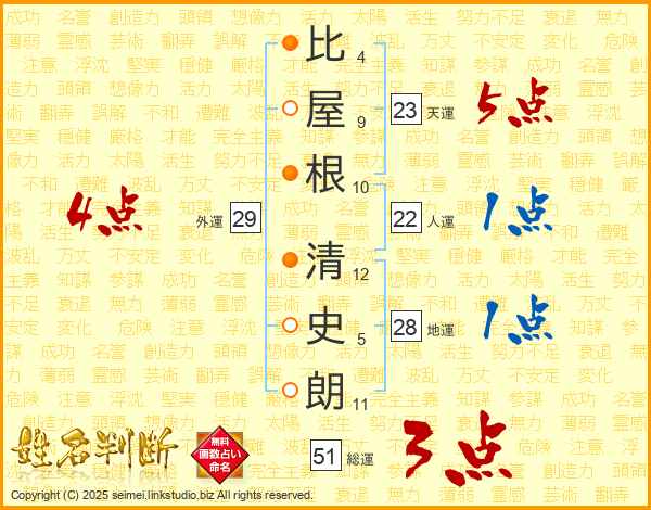 比(4画)屋(9画)根(10画) 清(12画)史(5画)朗(11画)