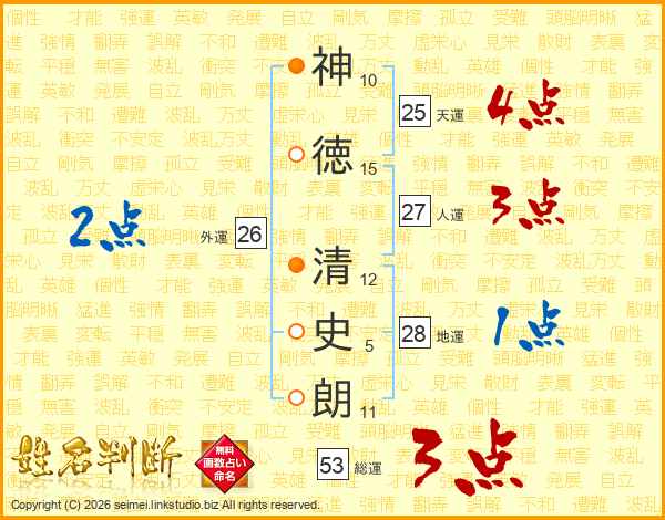 神(10画)徳(15画) 清(12画)史(5画)朗(11画)