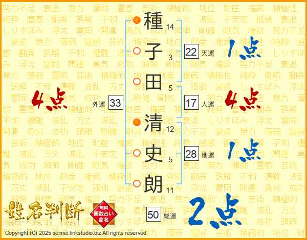 種(14画)子(3画)田(5画) 清(12画)史(5画)朗(11画)