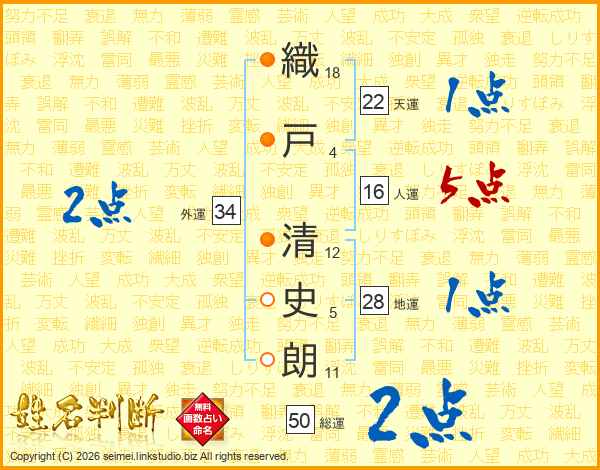 織(18画)戸(4画) 清(12画)史(5画)朗(11画)