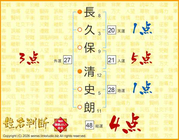 長(8画)久(3画)保(9画) 清(12画)史(5画)朗(11画)