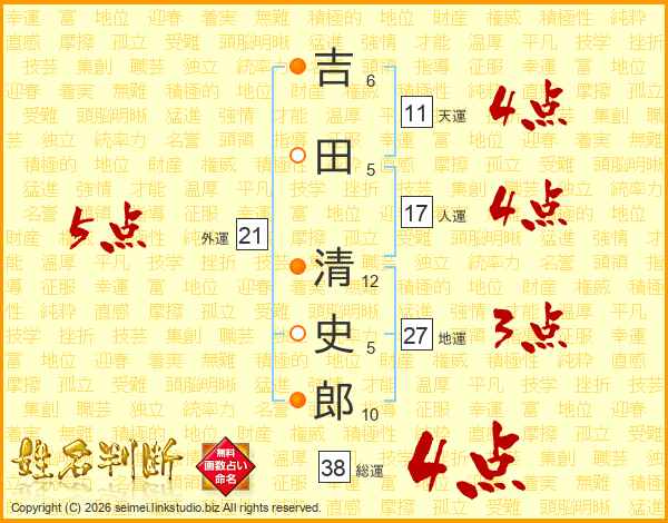 吉(6画)田(5画) 清(12画)史(5画)郎(10画)