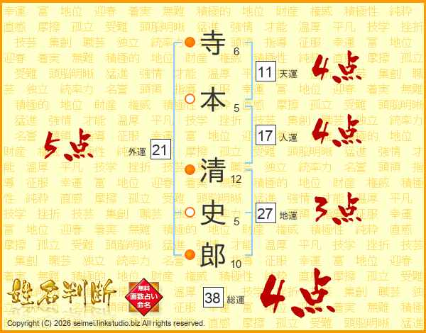寺(6画)本(5画) 清(12画)史(5画)郎(10画)