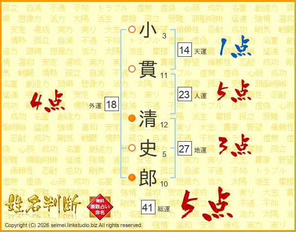 小貫清史郎さんの総運は41画の5点!