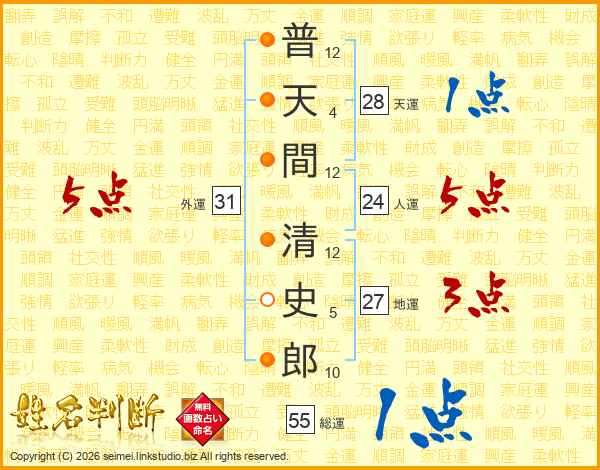 普(12画)天(4画)間(12画) 清(12画)史(5画)郎(10画)