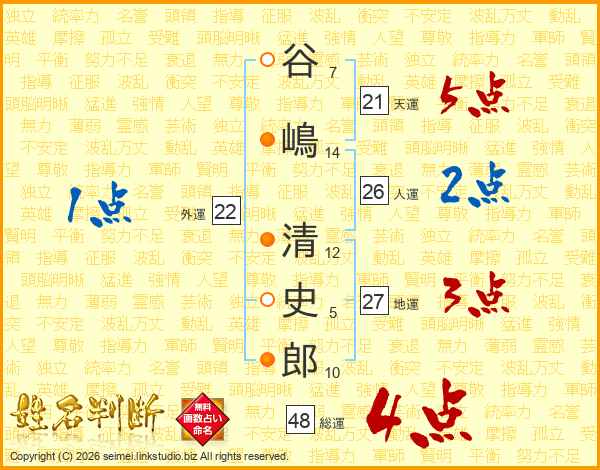 谷(7画)嶋(14画) 清(12画)史(5画)郎(10画)
