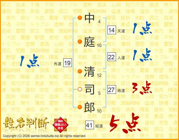 中庭清司郎さんの総運は41画の5点!