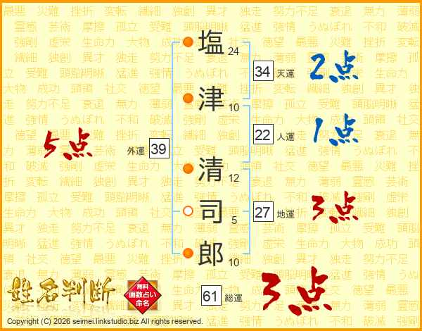 塩(24画)津(10画) 清(12画)司(5画)郎(10画)