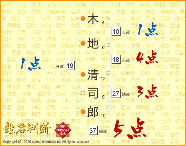 木(4画)地(6画) 清(12画)司(5画)郎(10画)