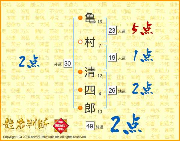 亀(16画)村(7画) 清(12画)四(4画)郎(10画)