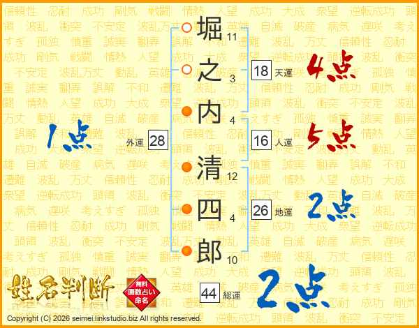 堀(11画)之(3画)内(4画) 清(12画)四(4画)郎(10画)