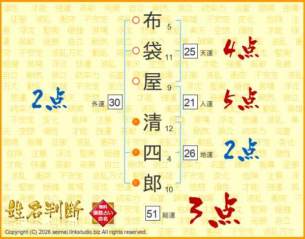 布(5画)袋(11画)屋(9画) 清(12画)四(4画)郎(10画)