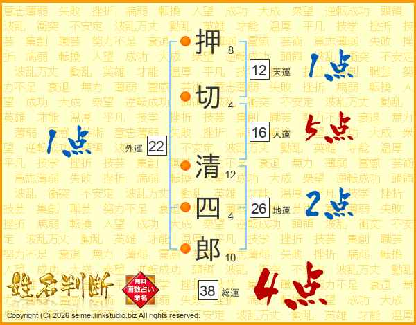 押(8画)切(4画) 清(12画)四(4画)郎(10画)