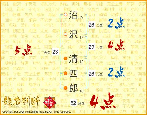 沼(9画)沢(17画) 清(12画)四(4画)郎(10画)
