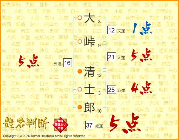 大(3画)峠(9画) 清(12画)士(3画)郎(10画)