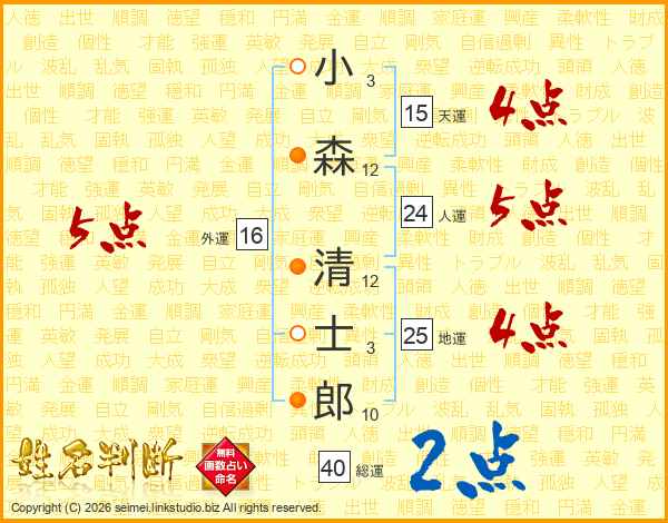 小(3画)森(12画) 清(12画)士(3画)郎(10画)