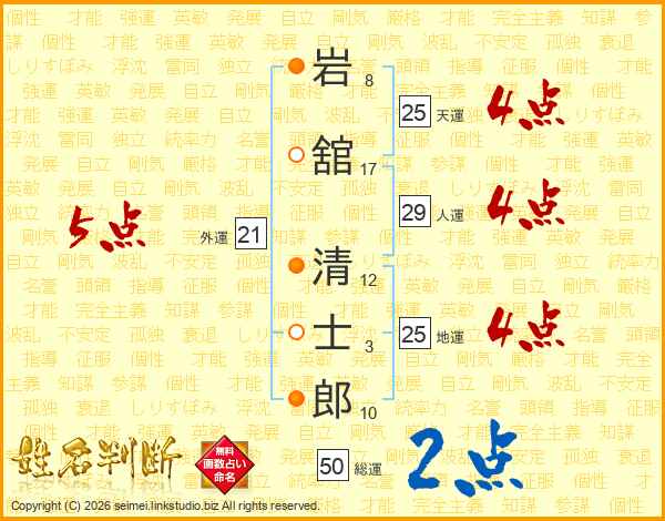岩舘清士郎さんの天運は25画の4点!