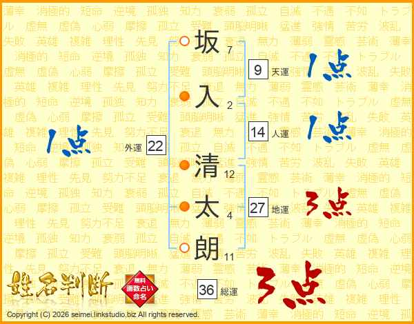 坂(7画)入(2画) 清(12画)太(4画)朗(11画)
