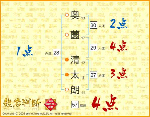 奥(13画)薗(17画) 清(12画)太(4画)朗(11画)