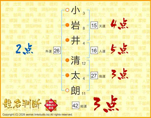 小(3画)岩(8画)井(4画) 清(12画)太(4画)朗(11画)