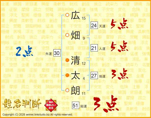 広(15画)畑(9画) 清(12画)太(4画)朗(11画)