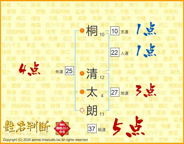 あなたの人生を表す1番重要な運勢です。生涯を通じて影響する総合運となり、主に50歳以降の晩年期に影響を及ぼします。苗字と名前の合計画数。
