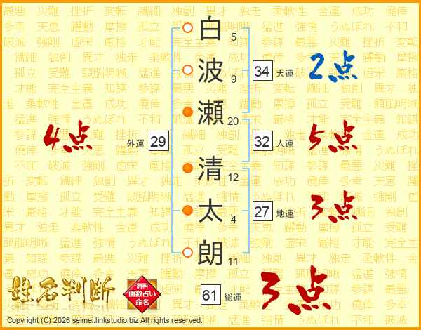 白(5画)波(9画)瀬(20画) 清(12画)太(4画)朗(11画)