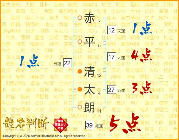 赤(7画)平(5画) 清(12画)太(4画)朗(11画)